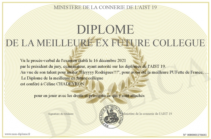 Envoyez par email votre Diplôme de la meilleure ex future collègue personalisé