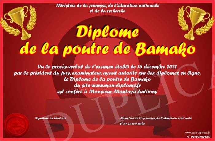 Envoyez par email votre Diplôme de la poutre de Bamako personalisé