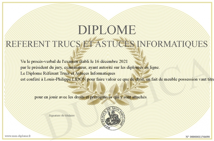 Envoyez par email votre Diplôme Référent Trucs et Astuces Informatiques personalisé