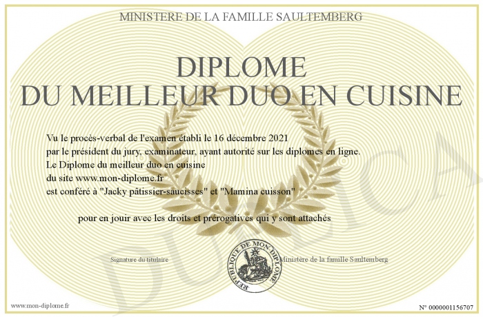Envoyez par email votre Diplôme du meilleur duo en cuisine personalisé