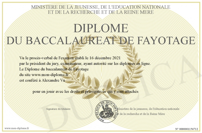 Envoyez par email votre Diplôme du baccalaureat de Fayotage personalisé