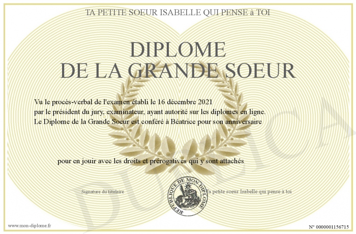 Envoyez par email votre Diplôme de la Grande Soeur personalisé