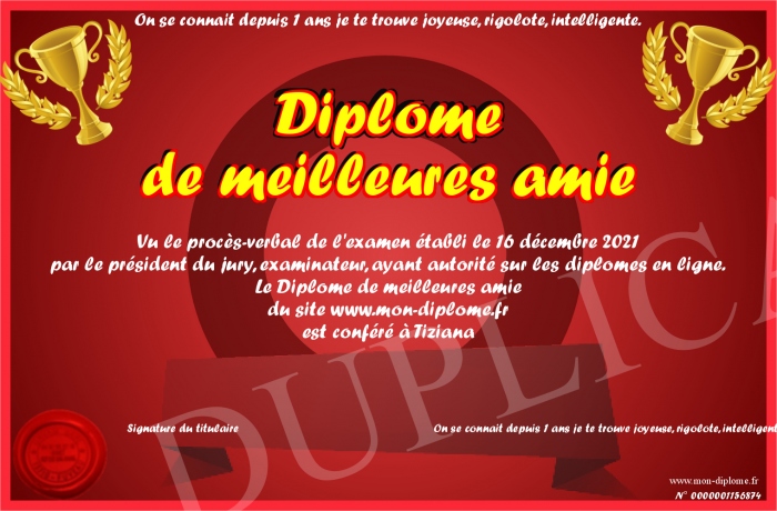 Envoyez par email votre Diplôme de meilleures amie personalisé