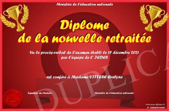 Envoyez par email votre Diplôme de la nouvelle retraitée personalisé