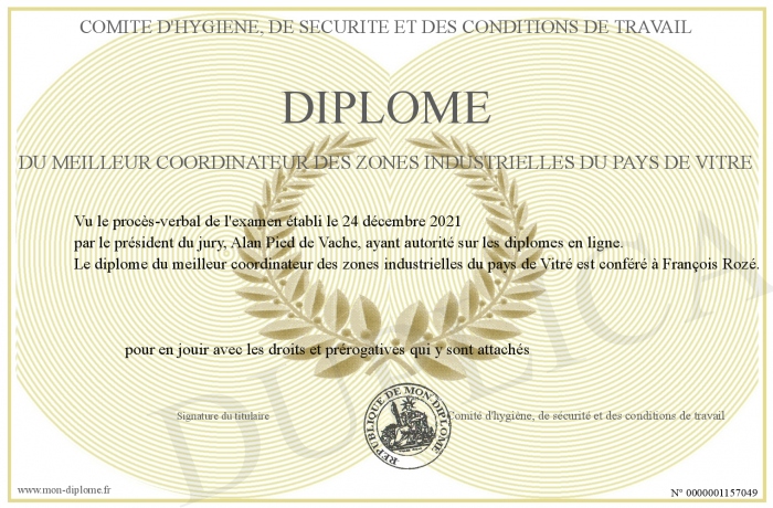 Envoyez par email votre diplôme du meilleur coordinateur des zones industrielles du pays de Vitré personalisé