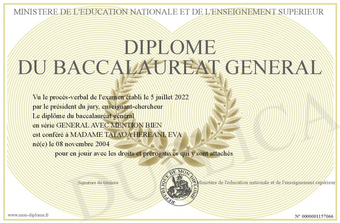Envoyez par email votre Diplôme du baccalaureat général personalisé