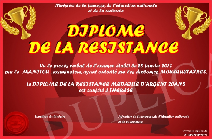 Envoyez par email votre DIPLOME DE LA RESISTANCE personalisé