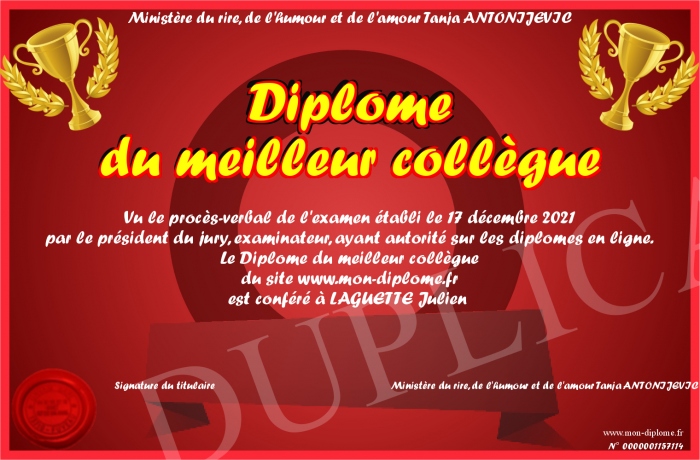 Envoyez par email votre Diplôme du meilleur collègue personalisé