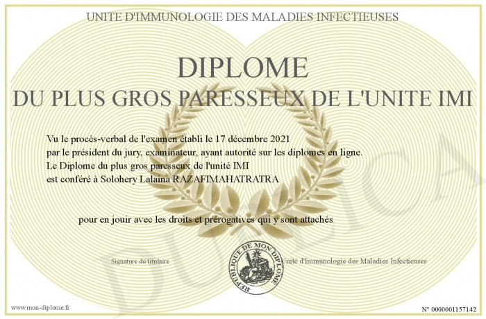 Envoyez par email votre Diplôme du plus gros paresseux de l'unité IMI personalisé