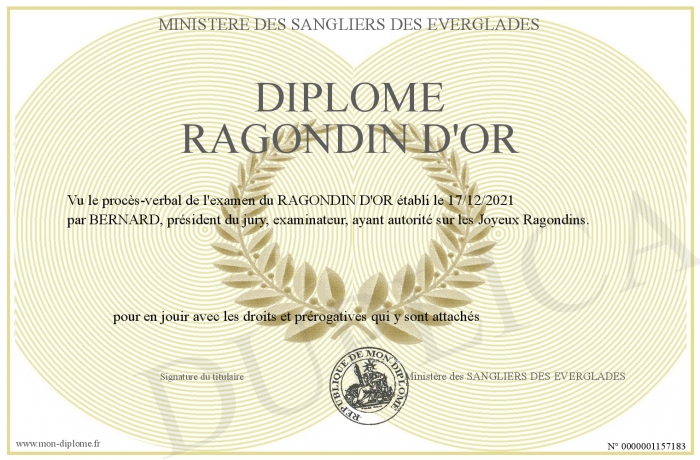 Envoyez par email votre Diplôme RAGONDIN D'OR personalisé