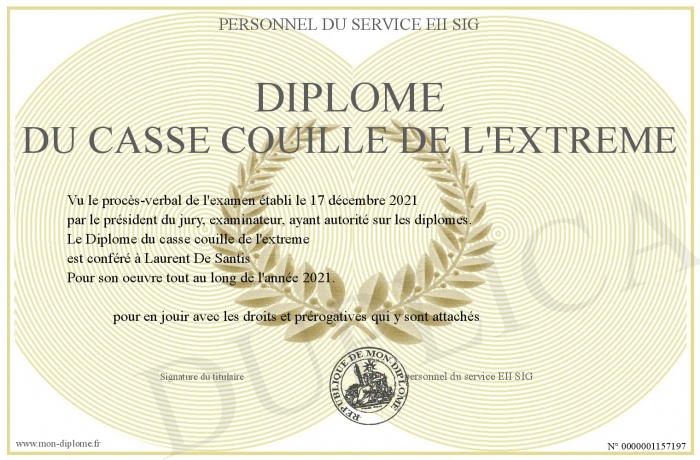 Envoyez par email votre Diplôme du casse couille de l'extreme personalisé
