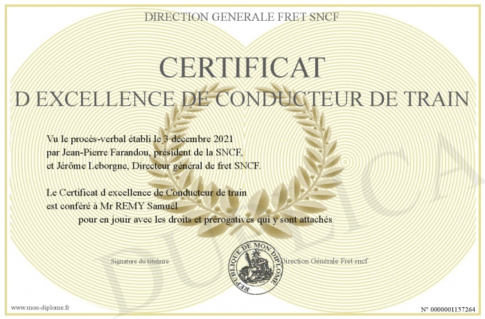 Envoyez par email votre Certificat d excellence de Conducteur de train personalisé