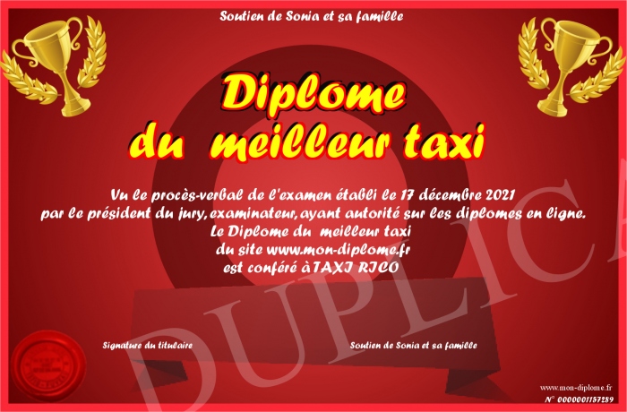 Envoyez par email votre Diplôme du meilleur taxi personalisé