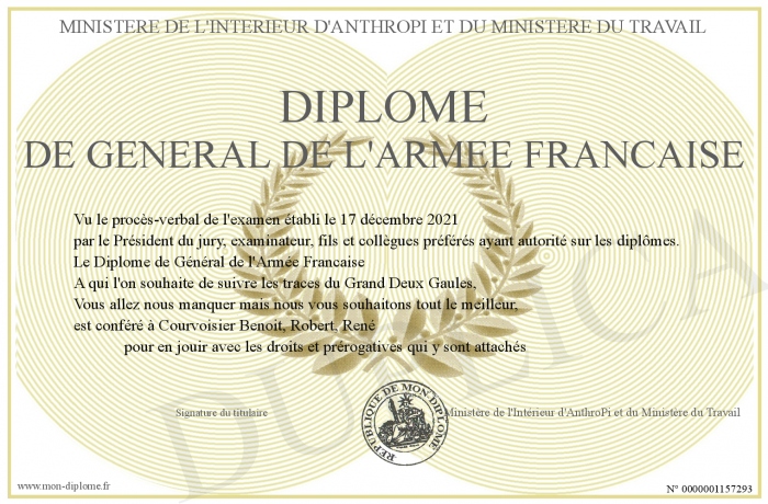 Envoyez par email votre Diplôme de Général de l'Armée Francaise personalisé