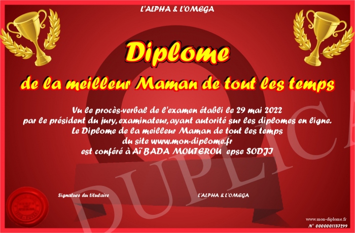 Envoyez par email votre Diplôme de la meilleur Maman de tout les temps personalisé