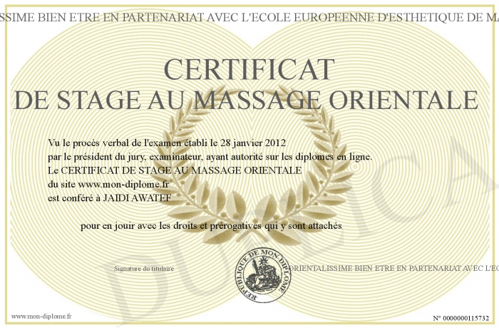 Envoyez par email votre CERTIFICAT DE STAGE AU MASSAGE ORIENTALE personalisé