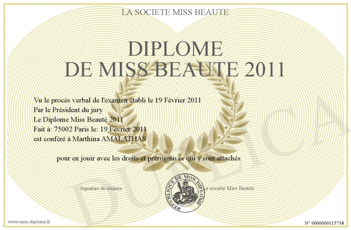 Envoyez par email votre Diplôme de Miss Beauté 2011 personalisé