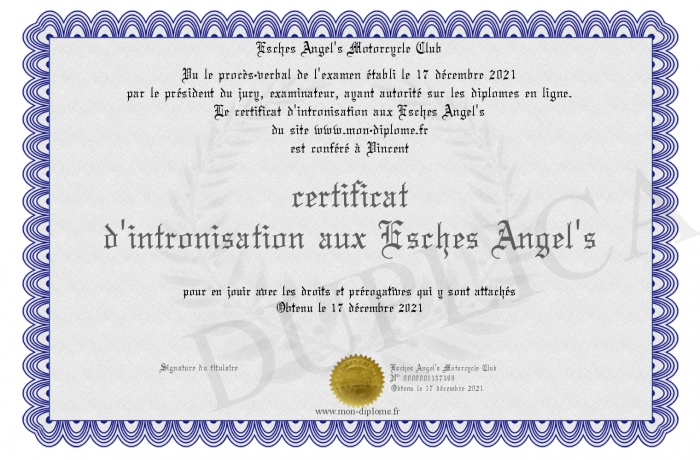 Envoyez par email votre certificat d'intronisation aux Esches Angel's personalisé