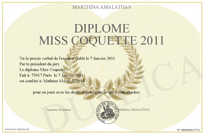 Envoyez par email votre DIPLOME MISS COQUETTE 2011 personalisé