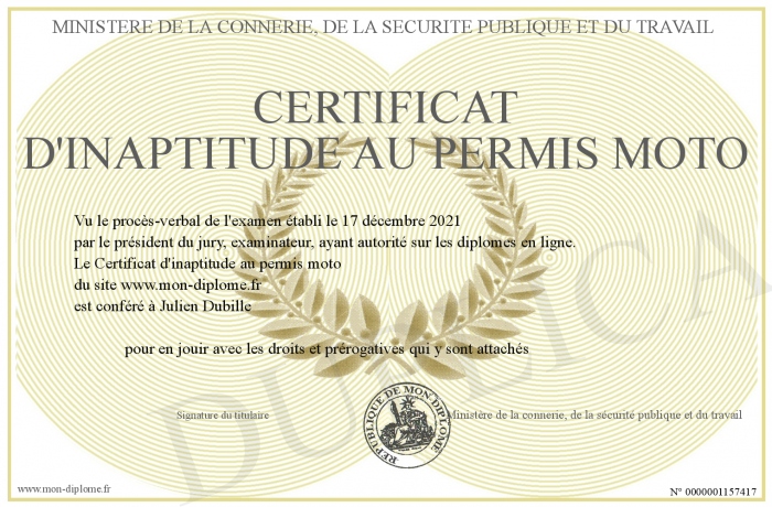 Envoyez par email votre Certificat d'inaptitude au permis moto personalisé