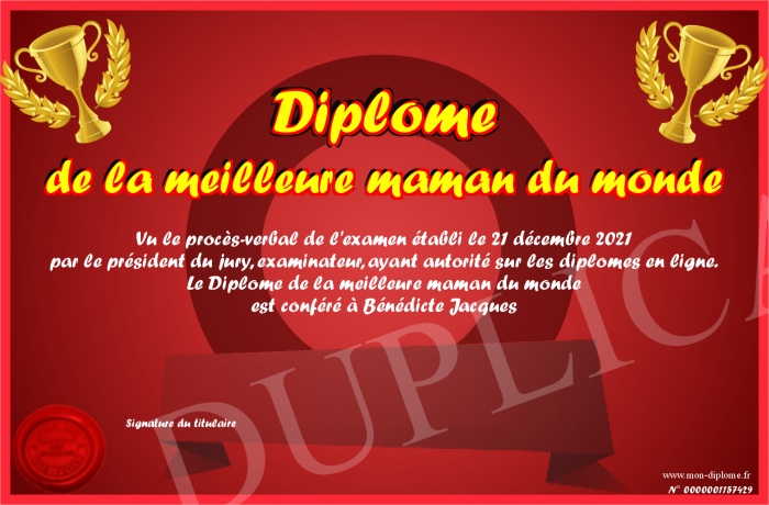 Envoyez par email votre Diplôme de la meilleure maman du monde personalisé