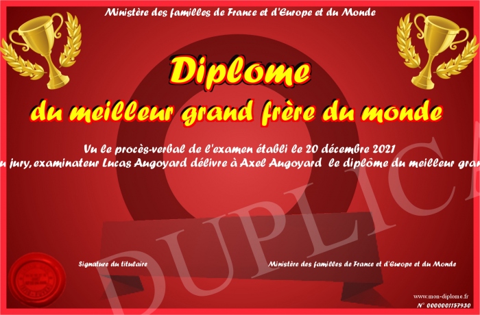 Envoyez par email votre Diplôme du meilleur grand frère du monde personalisé