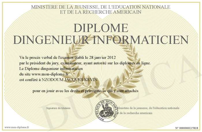 Envoyez par email votre Diplôme dingenieur informaticien personalisé