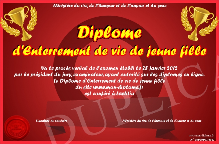 Envoyez par email votre Diplome d'Enterrement de vie de jeune fille personalisé