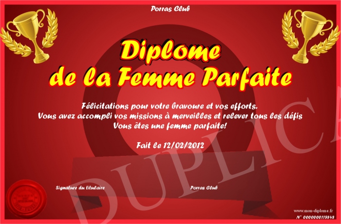 Envoyez par email votre Diplome de la Femme Parfaite personalisé