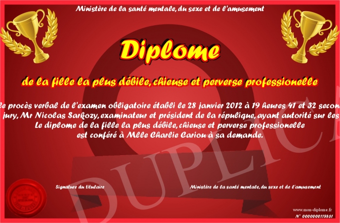 Envoyez par email votre Diplôme de la fille la plus débile, chieuse et perverse professionelle personalisé