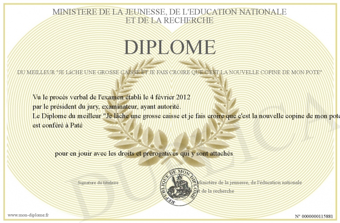 Envoyez par email votre Diplôme du meilleur -Je lâche une grosse caisse et je fais croire que c'est la nouvelle copine de mon pote- personalisé
