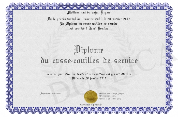 Envoyez par email votre Diplôme du casse-couilles de service personalisé