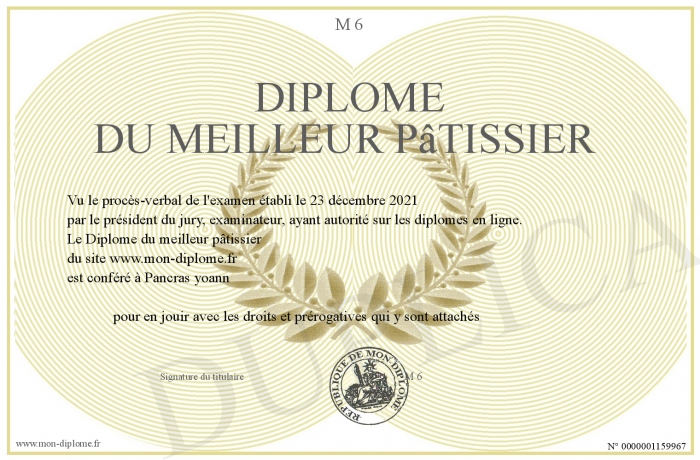 Envoyez par email votre Diplôme du meilleur pâtissier personalisé