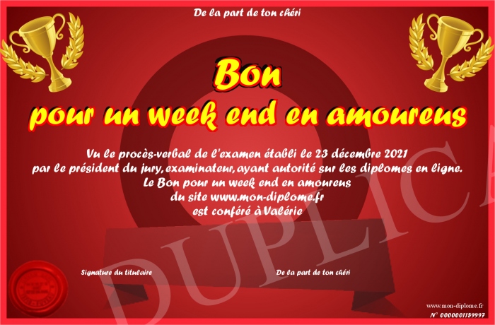 Envoyez par email votre Bon pour un week end en amoureus personalisé