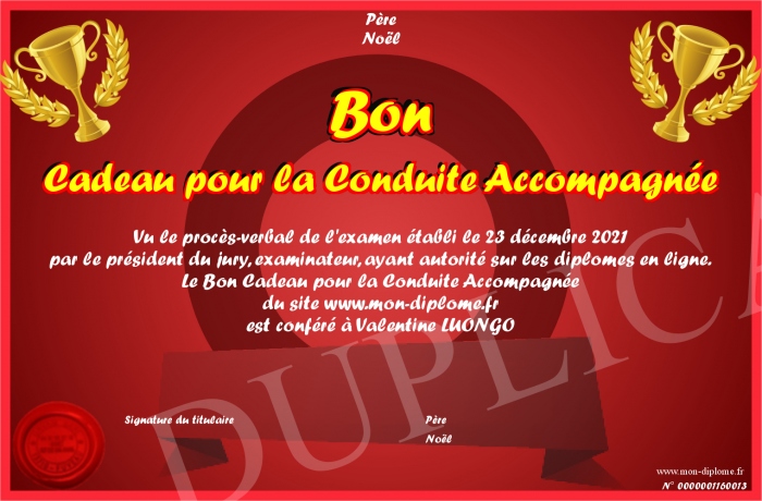 Envoyez par email votre Bon Cadeau pour la Conduite Accompagnée personalisé