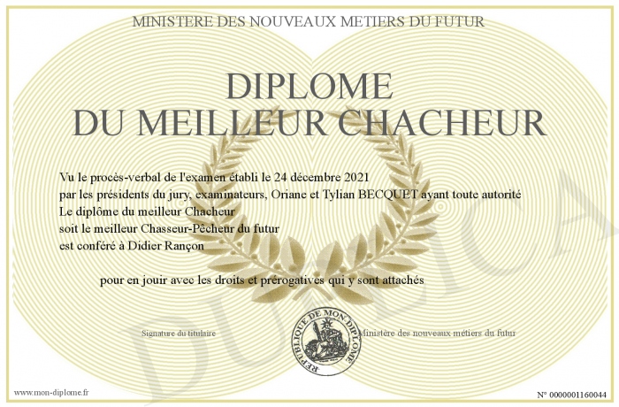 Envoyez par email votre Diplôme du meilleur Chacheur personalisé