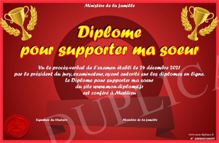 Envoyez par email votre Diplôme pour supporter ma soeur personalisé