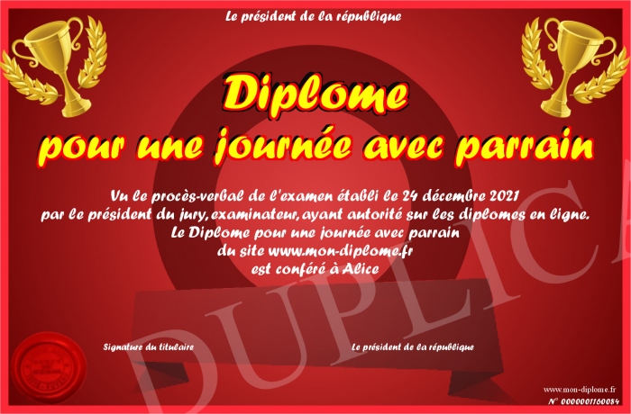 Envoyez par email votre Diplôme pour une journée avec parrain personalisé