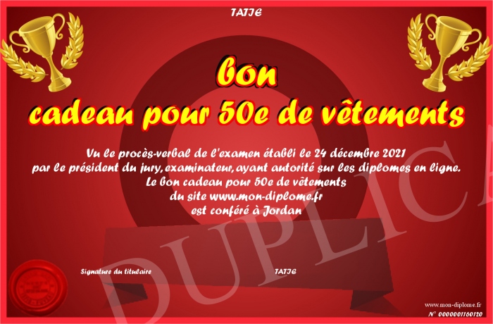 Envoyez par email votre bon cadeau pour 50e de vêtements personalisé