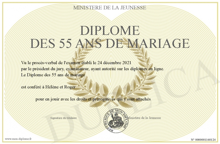 Envoyez par email votre Diplôme des 55 ans de mariage personalisé