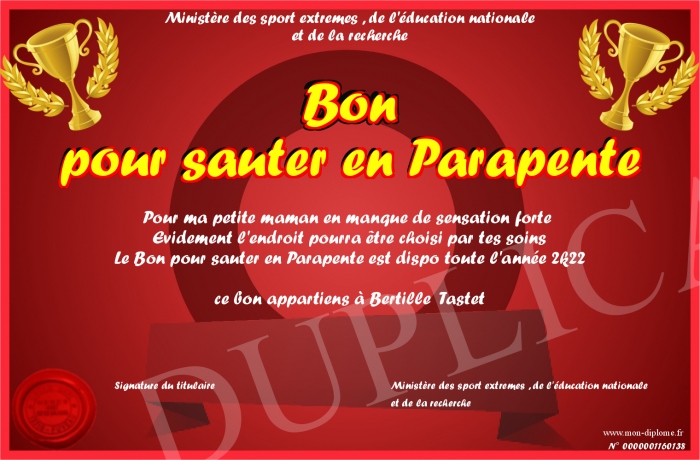 Envoyez par email votre Bon pour sauter en Parapente personalisé