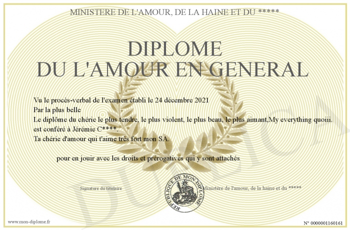 Envoyez par email votre Diplôme du l'amour en general personalisé