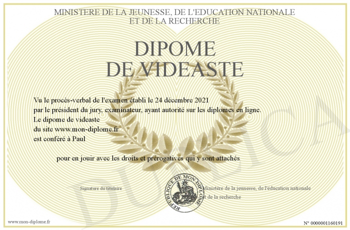 Envoyez par email votre dipôme de videaste personalisé