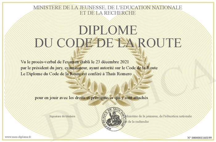 Envoyez par email votre Diplôme du Code de la Route personalisé