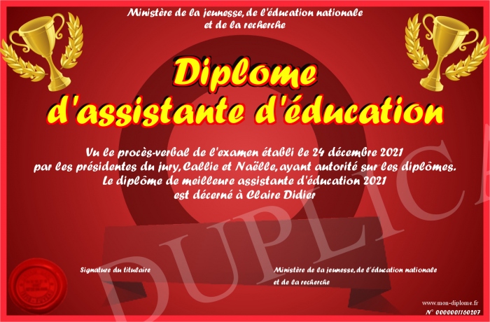 Envoyez par email votre Diplôme d'assistante d'éducation personalisé