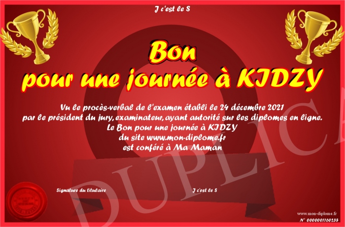 Envoyez par email votre Bon pour une journée à KIDZY personalisé