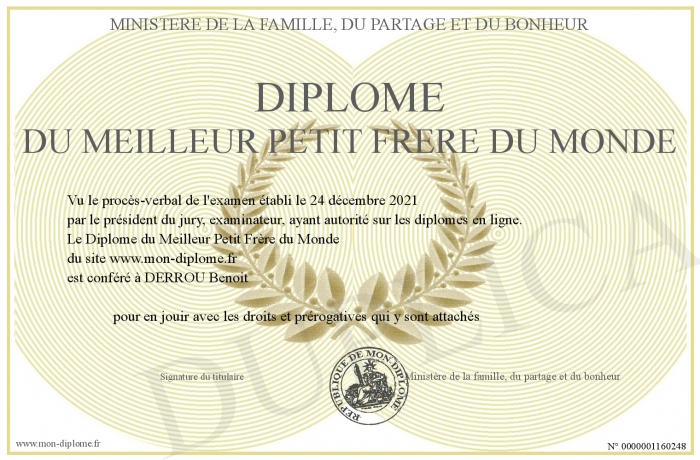 Envoyez par email votre Diplôme du Meilleur Petit Frère du Monde personalisé