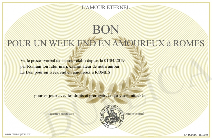 Envoyez par email votre Bon pour un week end en amoureux à ROMES personalisé