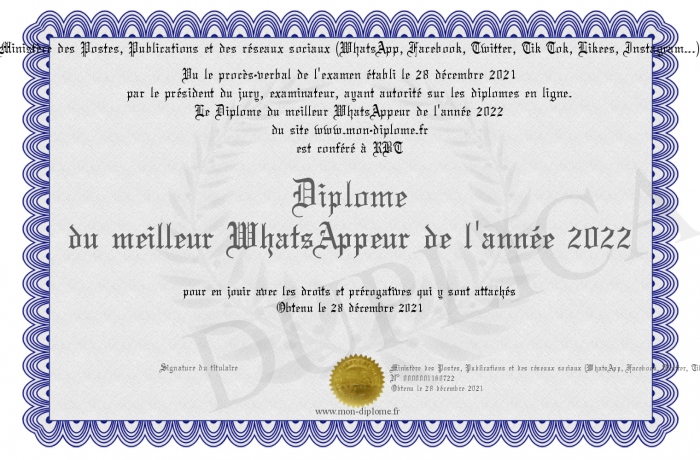 Envoyez par email votre Diplôme du meilleur WhatsAppeur de l'année 2022 personalisé