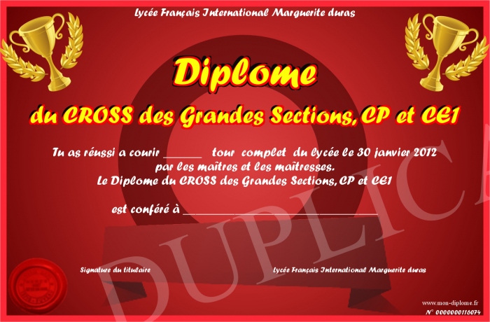 Envoyez par email votre Diplôme du CROSS des Grandes Sections, CP et CE1 personalisé